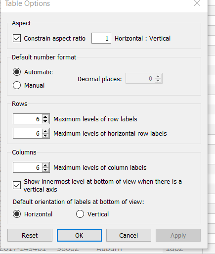Afterwards change the Value of default 6 from Rows (Maximum level of row labels & Maximum levels of horizontal row labels ) as shown below to 16, which is the max amount of columns Tableau allows, as of now.